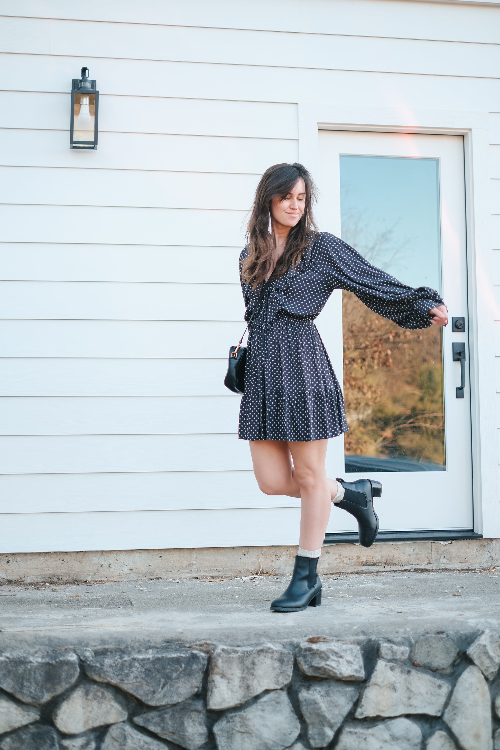 Such a sweet flouncy dress that could double as part of a really chic Mini Mouse costume when Halloween rolls around this fall. Classic small poika dot print on charcoal rayon fabric. The brand is BaliElf.
