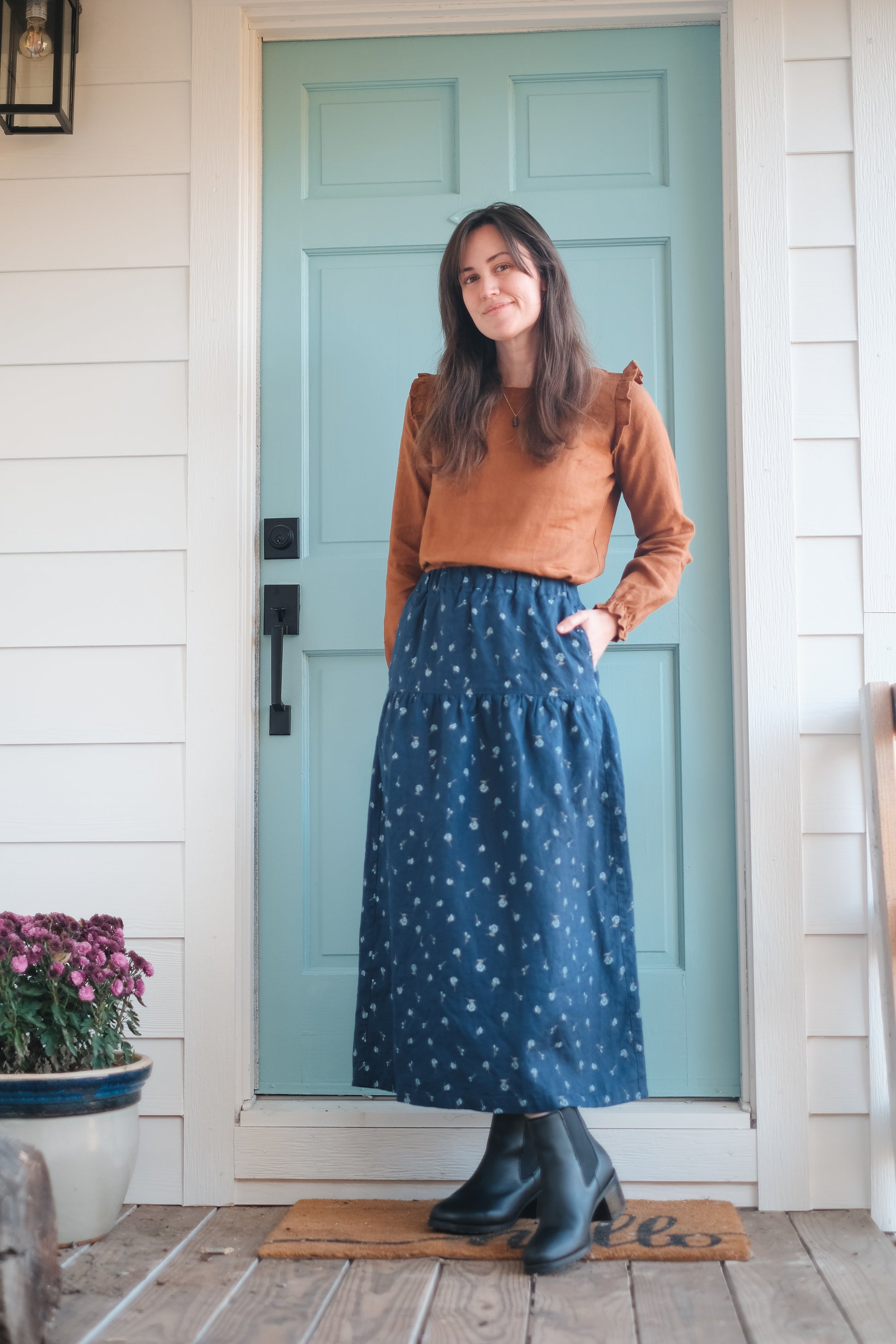 This 100% linen long sleeve top is from not Perfect Linen in their Toast color. It features a small ruffle at the shoulder seem, delicate bust darts and elastic gathers at the wrists.