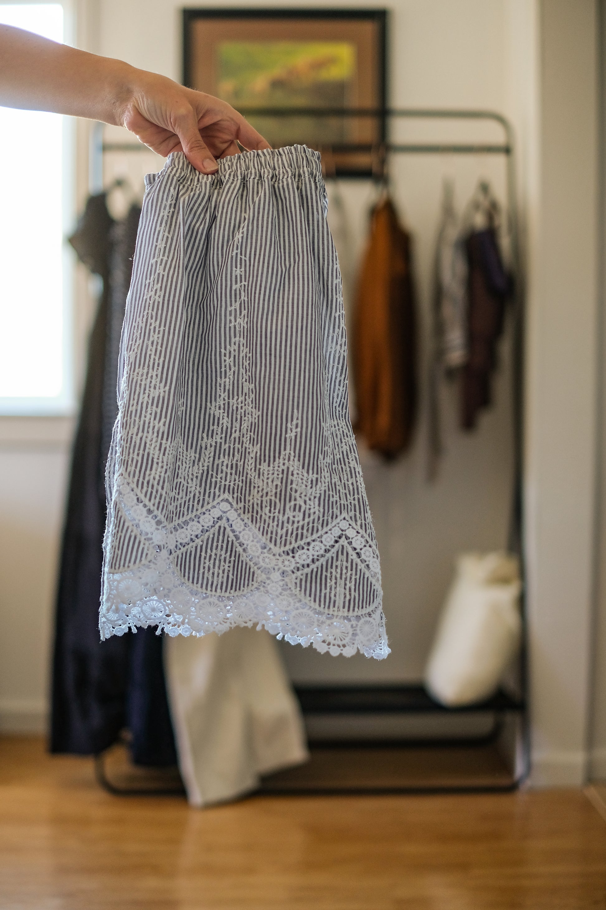 This set includes a Ganni inspired tie front tank with lace trim and matching elastic waist high rise shorts in a light pin stripe cotton blend fabric. I sewed it for myself but accidentally cut the pattern too small. The top is size XXS - XS. It measures 16" across the bust (for a total of 32" bust measurement). And the shorts are are a little bigger size S.