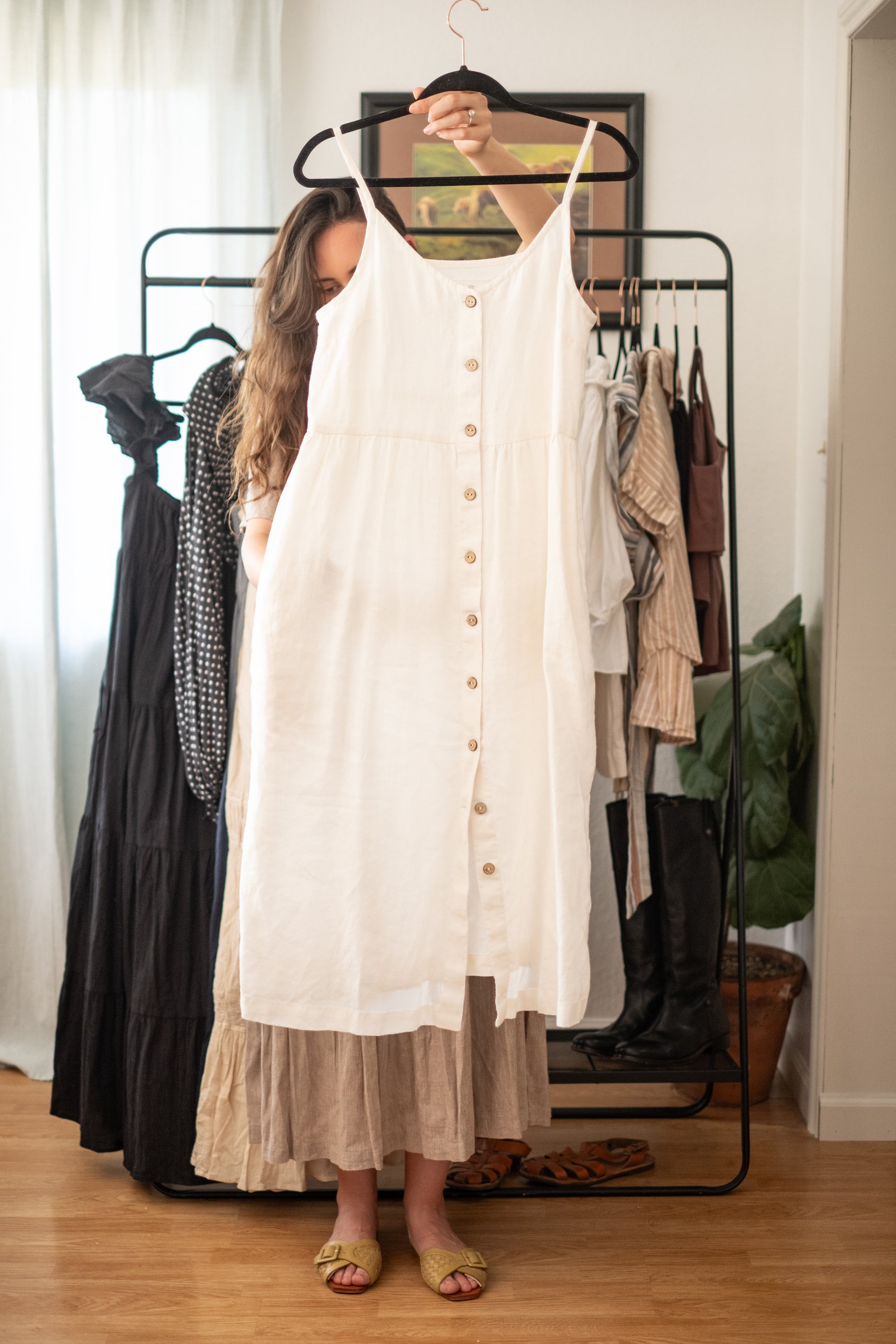 Lovely white/soft cream midi length 100% linen button front dress from not Perfect Linen. This is their Sarah style dress. Perfect condition.