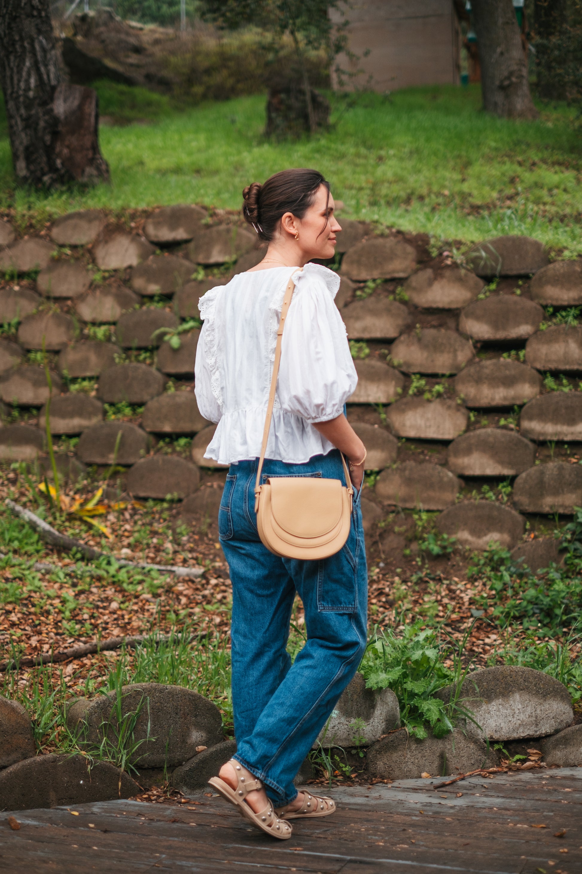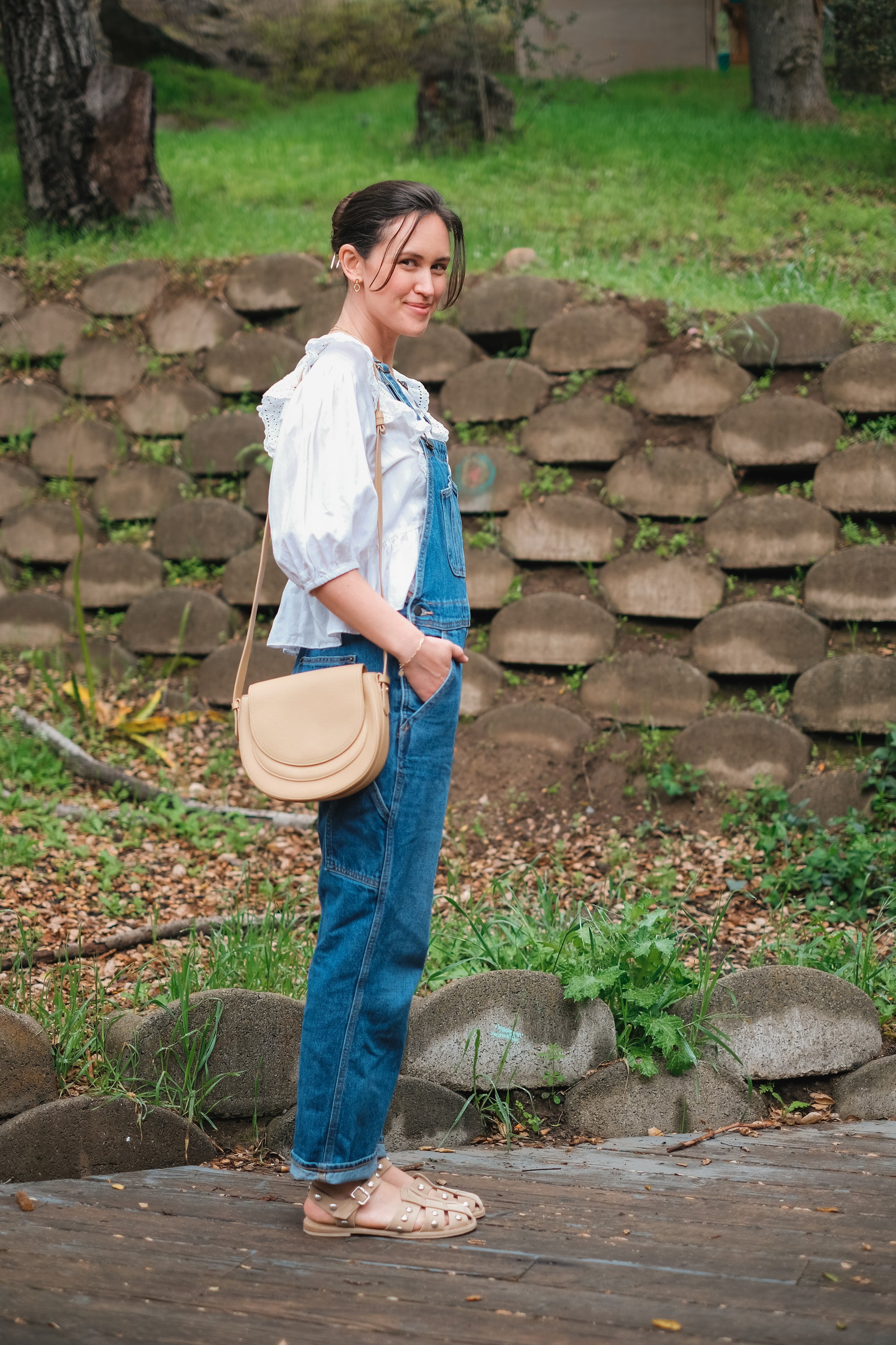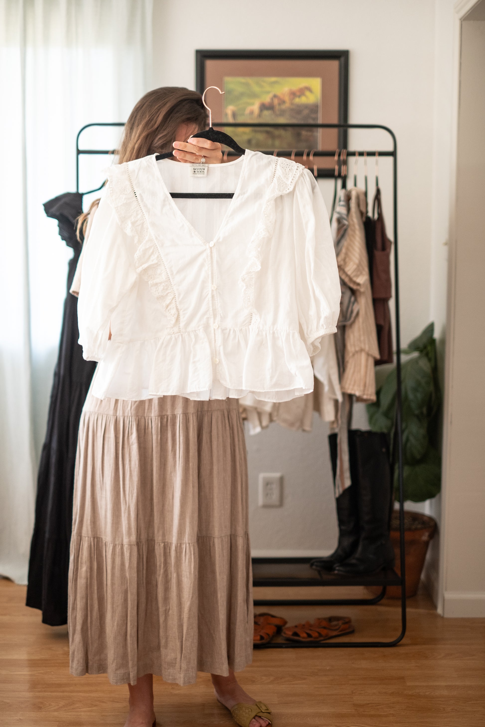 This is a really sweet 100% organic cotton top bursting with feminine details like lace, open needlework and a button front. The brand is called Scotch and Soda Amsterdam, and the sleeves are 3/4 elbow length.